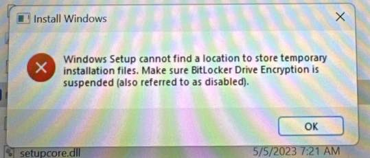 The message "Make sure BitLocker Drive Encryption is suspended" could appear from the Windows Setup when you press Enter. Refer to our BitLocker decrypting instructions to resolve this, then retry from step 5 onwards